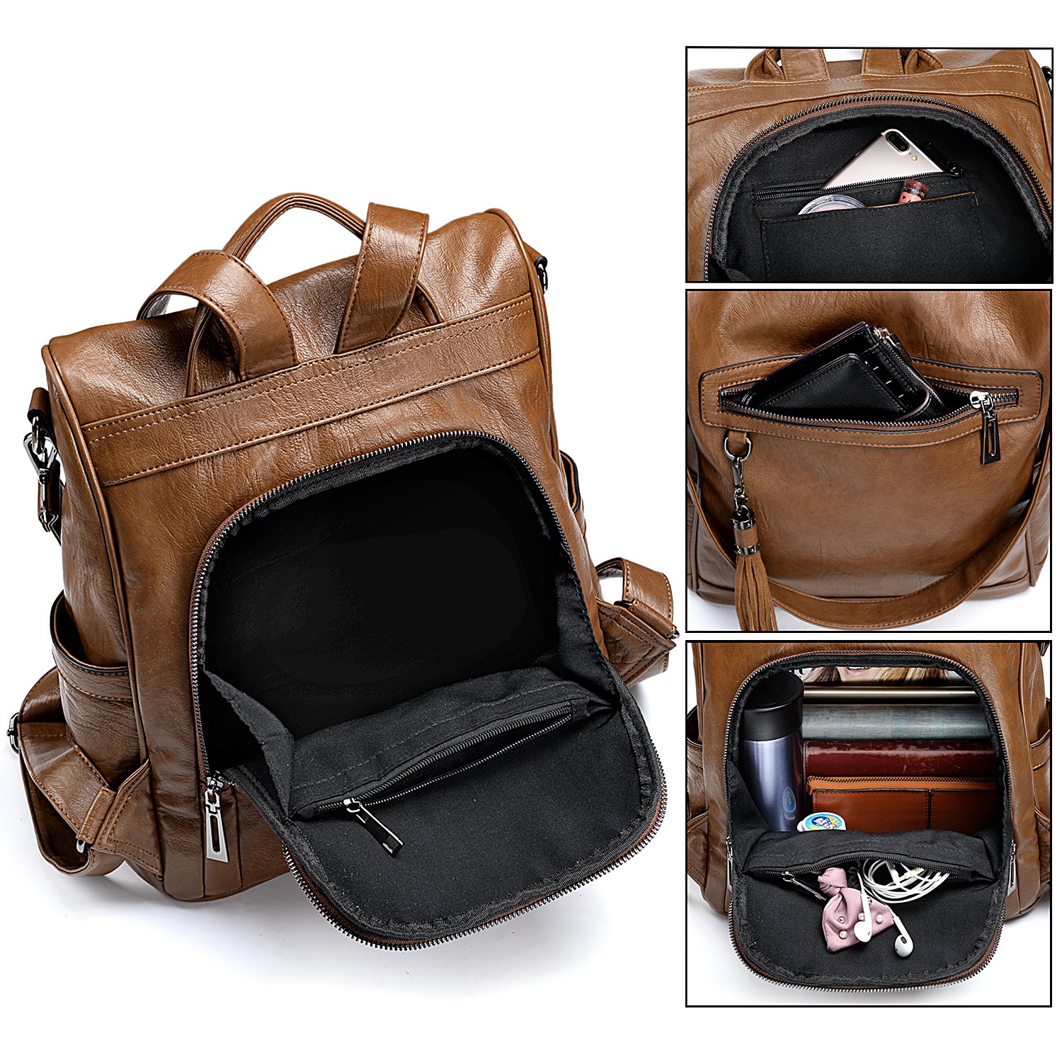 Brun Sac Porte Dos Femme Anti Vol Cuir Synthetique Sac Uto Sac A Dos Purse Convertible Tassels Rucksack Sacs A Main Bagages